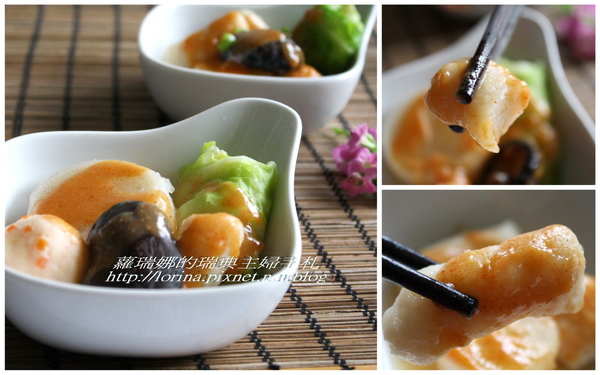 ◆ 將煮魚漿的水當高湯底,加入柴魚片、香菇、白蘿蔔一起燉煮,帶蘿蔔八九分熟時,再加入高麗菜捲、甜不辣、蝦丸,食用前淋上沾醬即可。