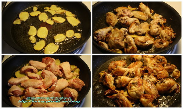 1.鍋中倒入苦茶油,用小火將薑片煸至乾扁狀,接著轉