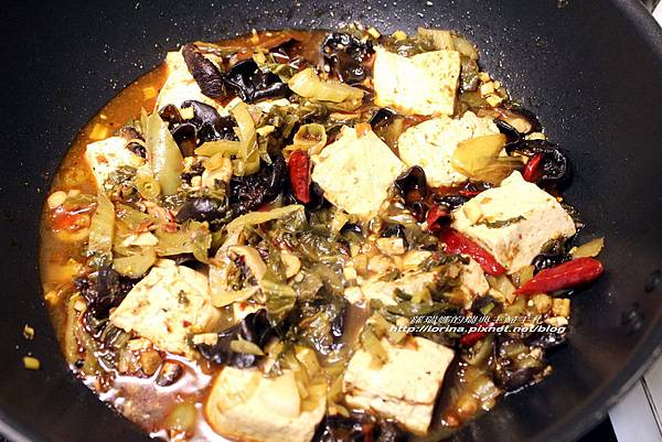 2. 加入酸菜、木耳拌炒接著加入醬油、糖及適量鹽巴,