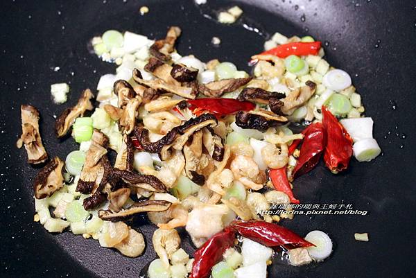 待鍋八分熱時接著放入蝦米及香菇絲炒香