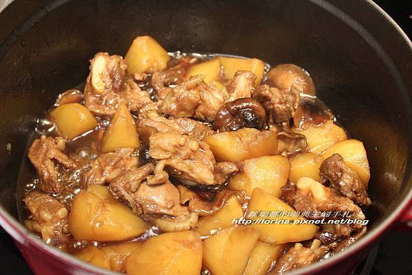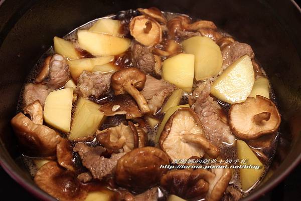 4. 放入馬鈴薯、香菇再依序加入米酒、醬油、烏醋及水,煮滾
